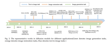 近年来,扩散模型作为生成模型的一个新分支浮现出来,为视觉生成任务带来了一系列的突破。扩散模型的原型可以追溯到工作[81],并由DDPM [82]、NCSN [83]和SDE [84]进一步发展。一般来说,扩散模型由前向/扩散过程和反向过程组成,其中前向过程逐渐增加像素级噪声到图像,直到它满足高斯噪声,而反向过程旨在通过估算得分的去噪[83]或噪声预测[82]来重建图像。与GANs相比,扩散模型产生高保真度和多样化的生成结果,从而成功地替代了在一系列领域中的GANs,如视觉生成[82-86]和条件视觉生成[86-97]。随着视觉-语言模型的进步,扩散模型已被扩展到跨模态生成,如StableDiffusion [98]和DALLE-2 [99]。这极大地推动了人工智能生成内容(AIGC)的发展。我们已经在图2中根据时间线列出了基于扩散模型的代表性作品。