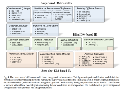 受到扩散模型优越的生成能力的启发,许多研究探索了它们在图像恢复任务中的应用,目标是促进纹理的恢复。根据训练策略,这些工作大致可以分为两类:1) 第一类[100–109]致力于通过有监督学习从零开始优化用于IR的扩散模型;2) 第二类(即零样本类)[110–117]努力利用预训练扩散模型中的生成先验用于IR。典型地,基于有监督学习的方法需要收集大规模的扭曲/清晰的图像对,而基于零样本的方法主要依赖已知的退化模式。这些局限性阻碍了这些基于扩散模型的方法在真实世界场景中的应用,其中的扭曲通常是多种多样和未知的。为了进一步解决上述问题,一些研究[118–123]已经扩展了扩散模型,通过结合真实世界的扭曲模拟、核估计、领域转换和扭曲不变学习来处理盲目/真实世界的图像恢复。