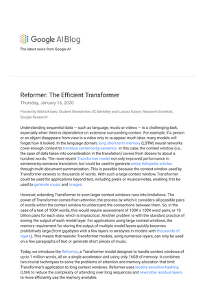 目前论文《Reformer: The Efficient Transformer》已经被ICLR 2020接收为Oral论文。更多细节可以参考原始论文。