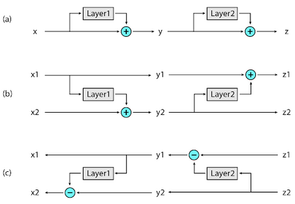 Reformer中实现的第二个新方法是在反向传播期间按需重新计算每个层的输入,而不是将其存储在内存中。这是通过使用可逆层来实现的,其中网络最后一层的激活值被用来恢复来自任何中间层的激活值,这相当于反向运行网络。在典型的残差网络中,栈中的每一层都不断地向传播信息中添加向量。每个可逆层有两组激活值,一个遵循刚才描述的标准过程逐层更新,但另一个只捕获变化。因此,要反向运行网络,只需在每层激活值间做简单的减法。