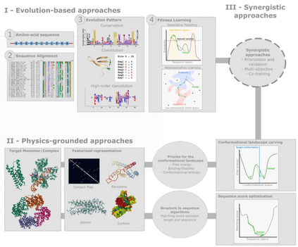 基于进化的方法,前者推断具有所需结构或功能的蛋白质序列集合共享的序列特征。后者使用机器学习surrogates估计关键生化特性,例如结构自由能、构象熵或结合亲和力。