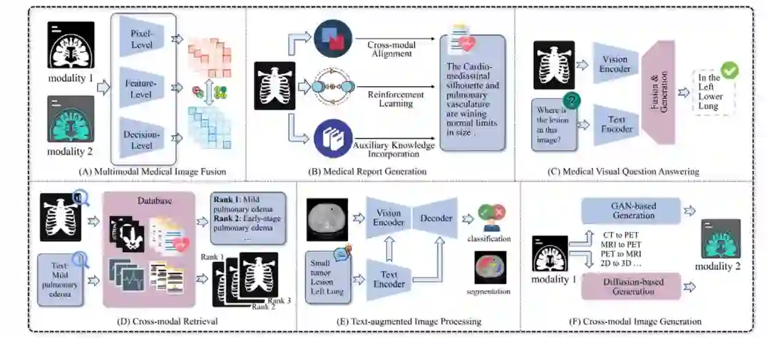 人工智能技术在医疗领域被广泛应用,本文介绍了六个方向上的相关工作:多模态图像融合、医学报告生成、医疗VQA、跨模态检索、文本增强图像处理、跨模态图像生成。