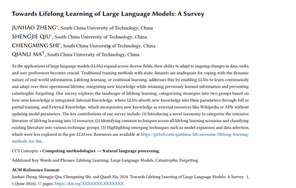 随着大语言模型(LLM)在各个领域的应用不断扩大,它们适应数据、任务和用户偏好的持续变化的能力变得至关重要。使用静态数据集的传统训练方法不足以应对现实世界信息的动态特性。终身学习或持续学习通过使LLM能够在其运行生命周期内持续学习和适应,整合新知识,同时保留先前学习的信息并防止灾难性遗忘来解决这一问题。我们的综述探讨了终身学习的现状,根据新知识的整合方式将策略分为两类:内在知识,LLM通过完全或部分训练将新知识吸收到其参数中;外部知识,通过将新知识作为外部资源(如维基百科或API)引入而不更新模型参数。我们的综述的主要贡献包括:(1)引入了一种新颖的分类法,将终身学习的大量文献划分为12种情景;(2)识别了所有终身学习情景中的常见技术,并将现有文献分类到不同的技术组中;(3)强调了在LLM之前时代较少探索的模型扩展和数据选择等新兴技术。资源可在https://github.com/qianlima-lab/awesome-lifelong-learningmethods-for-llm找到。