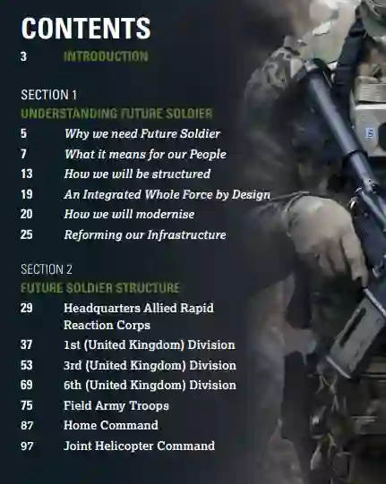 本指南阐述了陆军是如何变化的。它包含了未来陆军结构和每个单位(常规部队和后备部队)将发挥的作用的细节。它还描述了陆军将在何处驻扎,以及变化何时生效。