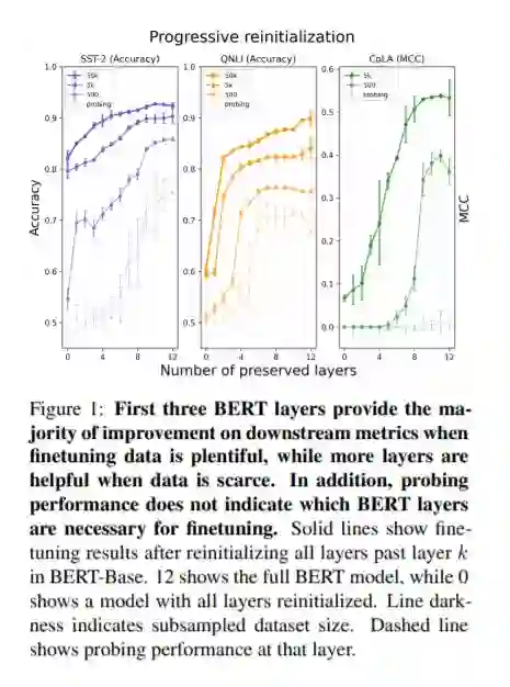 虽然探测是在预训练模型表示中识别知识的一种常见技术,但是尚不清楚这种技术是否能够解释像BERT这样在finetuning中端到端训练的模型的下游成功。为了解决这个问题,我们将探测与一种不同的可转移性度量进行比较:部分重新初始化的模型的微调性能的下降。该技术表明,在BERT中,对下游粘合任务具有高探测精度的层对这些任务的高精度来说既不是必要的,也不是充分的。此外,数据集的大小影响层的可移植性:一个人拥有的精细数据越少,BERT的中间层和后中间层就越重要。此外,BERT并没有简单地为各个层找到更好的初始化器;相反,层次之间的相互作用很重要,在细化之前重新排序BERT的层次会极大地损害评估指标。这些结果提供了一种理解参数在预训练语言模型中的可转移性的方法,揭示了这些模型中转移学习的流动性和复杂性。