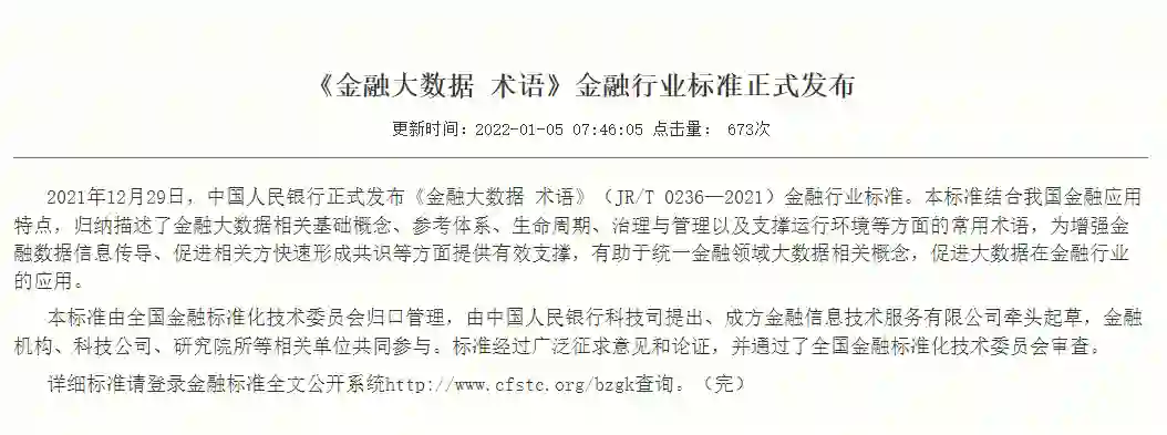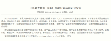 近日,据全国金融标准化技术委员会官网消息,中国人民银行发布《金融大数据 术语》(JR/T 0236—2021)金融行业标准。本标准结合我国金融应用特点,归纳描述了金融大数据相关基础概念、参考体系、生命周期、治理与管理以及支撑运行环境等方面的常用术语,为增强金融数据信息传导、促进相关方快速形成共识等方面提供有效支撑,有助于统一金融领域大数据相关概念,促进大数据在金融行业的应用。
