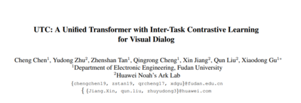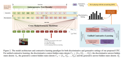 视觉对话旨在回答基于对话历史和图像内容的多轮互动问题。现有方法要么单独考虑答案排序和生成,要么仅通过两个单独的模型微弱地捕捉两个任务之间的关系。在单一模型中共同学习排序和生成答案的通用框架的研究很少。在本文中,我们提出了一个基于对比学习的框架UTC,以统一和促进识别任务和生成任务在视觉对话中使用单一的模型。具体来说,考虑到之前学习范式的内在局限性,我们设计了两种任务间对比损失,即情境对比损失和答案对比损失,使区分性任务和生成性任务相辅相成。这两种互补的对比损失利用对话语境和目标答案作为锚点,从不同的角度提供表征学习信号。我们在VisDial v1.0数据集上评估我们提出的UTC,在那里,我们的方法在鉴别和生成任务上优于最先进的技术,并在Recall@1上超过2个绝对点。