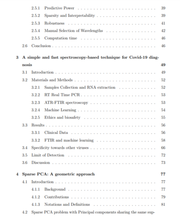 我们提供了稀疏建模的两个应用。第一个是关于混合整数优化稀疏回归在激光诱导击破光谱分析技术中的应用。我们在化学计量学中建立了一种稀疏和鲁棒模型的方法,并在各种类型的矿物矿石上进行了测试。MIO方法优于专家的预测,同时提供了与𝐿𝐴𝑆𝑆𝑂相比显著稀疏的模型。由于𝑅2在某些情况下达到的值高于0.99,据我们所知,这个应用程序是第一个带来经验证据的应用程序,证明在自然界中存在真正的支持,因为优化社区一直在质疑在现实生活中的应用程序中存在这样的概念。第二个应用与COVID检测和稀疏分类有关。我们提出了一种基于光谱的快速、简单的检测方法。这种新方法建立在机器学习能力的基础上,可以在一分钟内完成诊断,不使用任何试剂,达到接近PCR的精确度。稀疏方法能够检测SARS-CoV-2 RNA和蛋白质的3D结构中的特定特征。