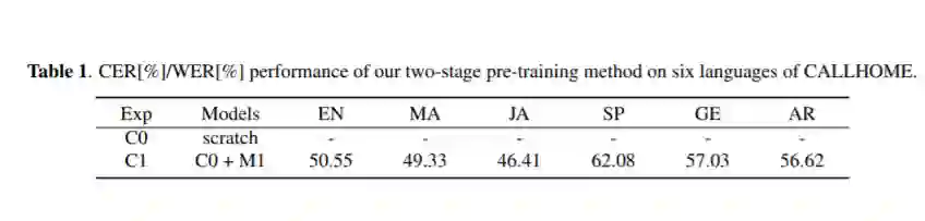 本文提出了一种新的编码-解码器序列到序列预训练模型(seq2seq)。我们的前训练方法分为两个阶段,分别是声学前训练和语言前训练。在声学预训练阶段,我们使用大量的语音来预训练编码器,通过预测掩蔽语音特征块及其上下文。在语言前训练阶段,我们使用单说话文本到语音(TTS)系统从大量的文本中生成合成语音,并使用合成的成对数据对译码器进行预训练。这种两阶段预训练方法将丰富的声学和语言知识整合到seq2seq模型中,有利于后续的自动语音识别(ASR)任务。在AISHELL-2数据集上完成无监督的预训练,我们将预训练模型应用于AISHELL-1和香港科技大学的多重配对数据比率。我们的相对错误率由AISHELL-1的38.24%降至7.88%,由香港科技大学的12.00%降至1.20%。此外,将我们的预训练模型应用到带有CALLHOME数据集的跨语言案例中。对于CALLHOME数据集中的所有六种语言,我们的预训练方法使模型始终优于基线。