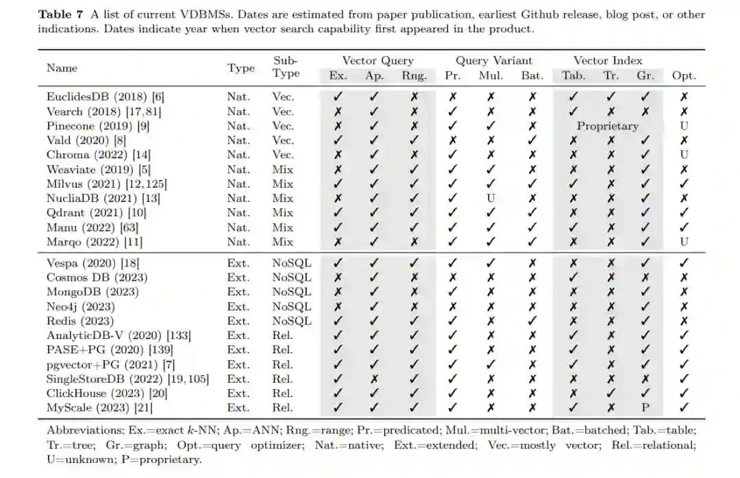 现如今,已有超过20种商业向量数据库管理系统(VDBMSs),它们都是在过去五年内推出的。但基于嵌入的检索(EBR)已经被研究了超过十年,而相似性搜索更是达到了惊人的半个世纪甚至更久。从算法转向系统的这一变革是由新的数据密集型应用驱动的,尤其是大型语言模型(LLMs),它们需要大量的非结构化数据,以及可靠、安全、快速且可扩展的查询处理能力。现有各种新的数据管理技术来满足这些需求,但尚无全面的调查来彻底审查这些技术和系统。