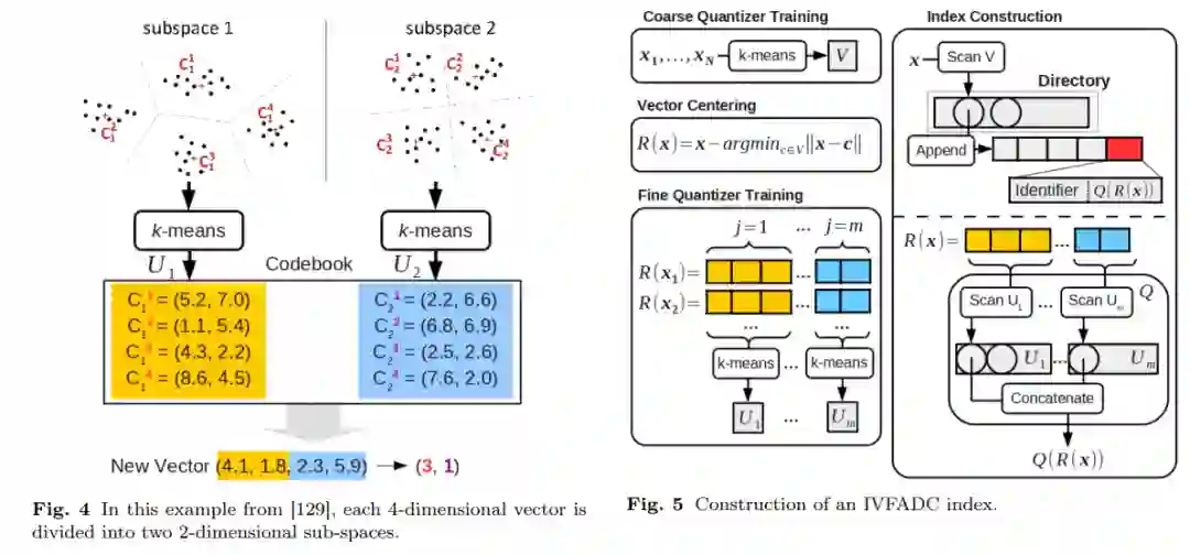 存储和索引。存储管理器主要处理如何组织和存储向量集合以支持高效准确的搜索。对于大多数系统,这是通过向量搜索索引实现的。我们将索引分类为基于表的索引,如E2LSH [49]、SPANN [44] 和IVFADC [69],这些索引通常容易更新;基于树的索引,如FLANN [96]、RPTree [47,48] 和ANNOY [1],旨在提供对数搜索;以及基于图的索引,如KGraph [52]、FANNG [66] 和HNSW [90],已经被证明在经验上表现良好,但理论理解较少。为了解决划分向量集合的难题,技术包括随机化[67,49,31,96,48,52,123,115]、学习划分[127,69,91,96,112]以及我们称之为“可导航”的划分[51,89,90]。为了处理大存储大小,已经为压缩向量上的索引开发了几种技术,包括量化[62,69,91,113,129,133],以及基于磁盘的索引[61,44]。我们在第3节中讨论索引。