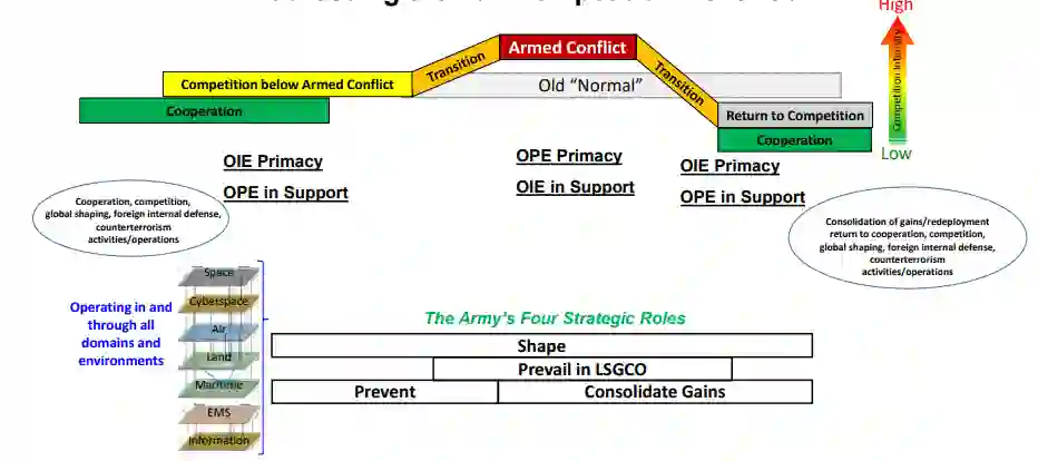 如上所述,陆军必须在所有领域和环境中运作,因为它提供了四个战略角色:塑造、预防、在LSGCO中获胜和巩固成果。为了实现这些作用,陆军必须为OPE和OIE提供能力。但是,在低于武装冲突的合作与竞争期间以及恢复竞争期间,OIE可能代表主要活动,而OPE则发挥辅助作用。在更传统的武装冲突期间,这些关系可能会颠倒过来,OPE官网成为主要活动,而OIE则是辅助活动。