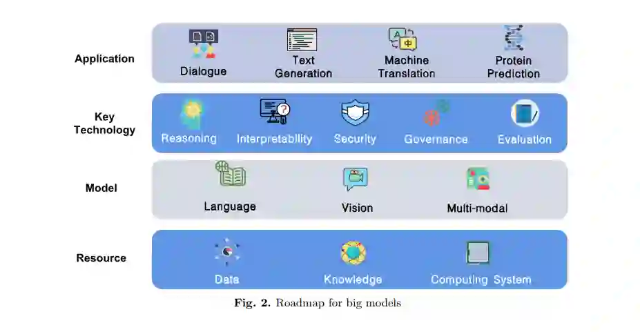 随着深度学习的快速发展,对多个下游任务进行大模型(Big Models, BMs)训练成为一种流行的范式。研究人员在BM的构建和BM在许多领域的应用方面取得了各种成果。目前,缺乏对BMs总体进展进行梳理和指导后续研究的研究工作。本文不仅介绍了BM技术本身,还介绍了BM技术运用BMs进行BM训练和应用的前提条件,将BM评审分为资源、模型、关键技术和应用四个部分。我们在这四个部分介绍了16个具体的BM相关主题,它们是数据、知识、计算系统、并行训练系统、语言模型、视觉模型、多模态模型、理论与可解释性、常识推理、可靠性与安全性、治理、评估、机器翻译、文本生成、对话和蛋白质研究。在每个课题中,我们对当前的研究进行了总结,并提出了未来的研究方向。最后,我们从一个更全面的角度总结了BM的进一步发展。