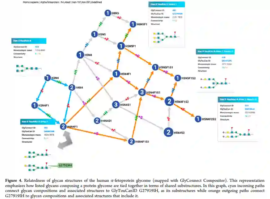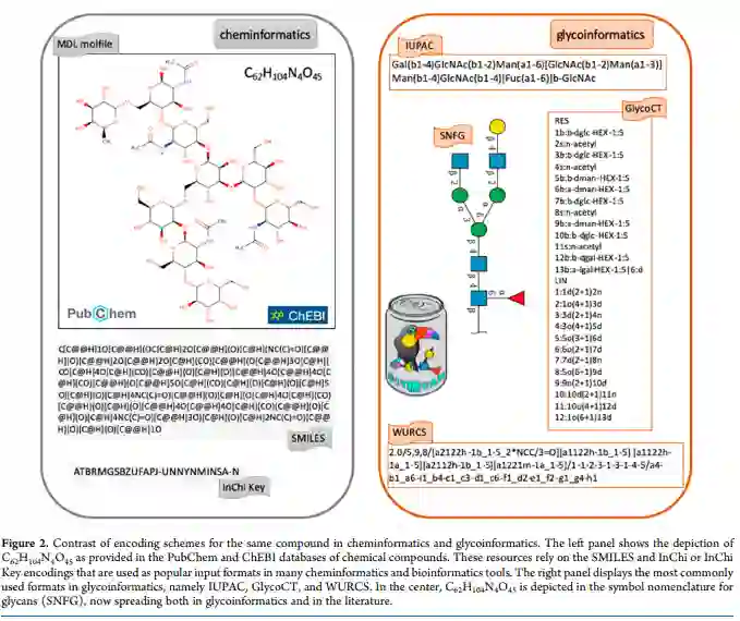 化学信息学与糖信息学的融合尚不清楚。GlyTouCan 的所有聚糖都在 IUPAC 中编码。该数据库中的每个结构都以聚糖的符号命名法 (SNFG) 表示,该命名法已被用作糖科学的标准。尽管如此,近年来,GlyTouCan、PubChem 和 ChEBI 之间更紧密的交互导致后两个数据库的聚糖条目中包含 WURCS 编码和 SNFG 符号。