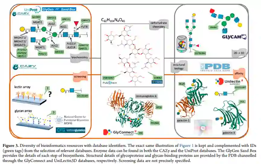 从生物信息学中吸取的教训 异质信息的精确记录和描述是一项明确的糖信息学挑战。图 3突出显示了引用每个实体的可能性:聚糖、其生物合成途径或它包含的表位,在适当的数据库中,具有唯一且稳定的标识符。这种观点在生物信息学中广泛传播,在糖信息学中并不完全现实。