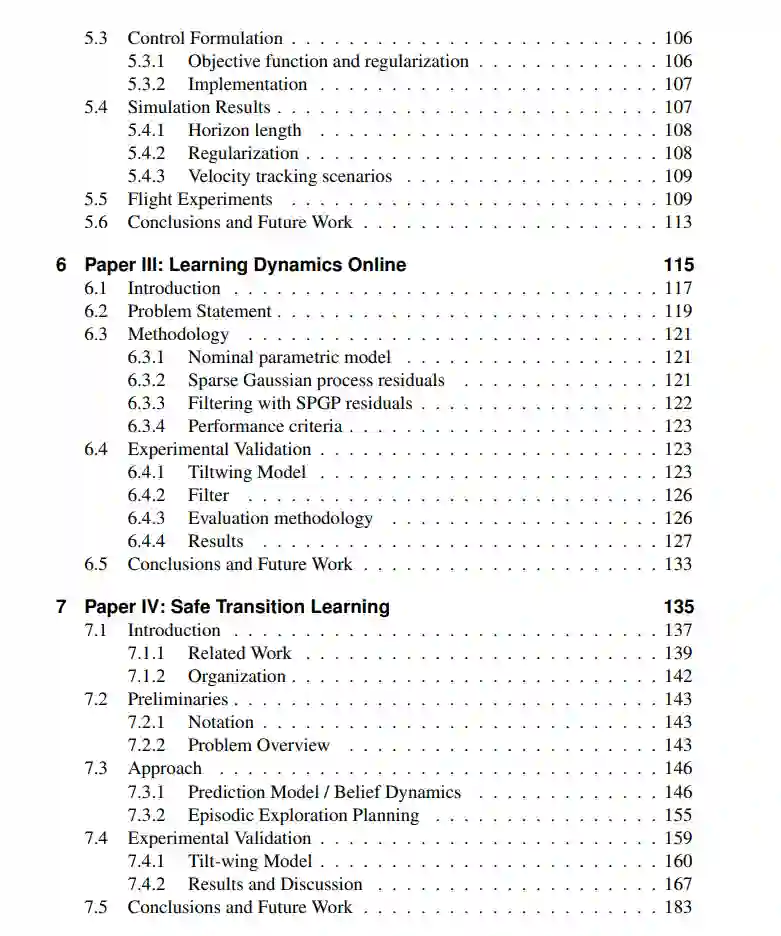 然而,控制设计面临多个挑战: 首先,H-UAVs是高度非线性的动态系统,在其飞行包线的不同飞行模式下具有根本不同的操作原理。第二,过渡飞行阶段通常受复杂且湍流的气动学支配,这对精确的动态建模提出挑战,例如从基本原理推导。为了进行基于模型的控制设计或仿真,获取实际系统的真实飞行数据变得至关重要。然而,由于收集这些数据需要飞行一个事先不确定的系统,并且该系统受到安全关键约束,我们还需要考虑模型不确定性对安全关键动作的影响。最后但同样重要的是,计算限制,尤其是在小型H-UAV上的计算能力,限制了合适方法论的算法复杂度。 本论文的目标是开发解决这些挑战的模型学习与控制策略,使我们能够在实际应用中安全地利用H-UAVs的多功能性。 首先,我们开发并验证了一个完整的控制栈,使得自动化任务能够充分利用H-UAVs的全飞行包线,并能够运行在微控制器上。我们使用该控制栈演示了有效载荷的放置与动态(前向飞行中的)回收,这一任务要求高精度的控制。我们提出了一种新型的路径跟踪引导方法,该方法统一了在不同运动学约束和控制模式下的高层操作,覆盖了整个飞行包线。最终生成的控制参考通过使用加速度测量的直接反馈,由反应式低级控制器精确跟踪。与现有技术相比,我们的方法在控制精度和抗干扰性方面有所改善,并降低了对模型准确性的要求。 其次,我们解决了纯反应控制方法的安全性限制。为了安全地执行动态机动,如模式切换,控制器必须预见快速变化的气动力以及可用的控制权,以防止违反安全关键的状态和输入约束。为此,我们提出了一种非线性模型预测控制(NMPC)方法,用于速度参考跟踪。我们探索并识别了能够足够精确捕捉气动力的模型公式,适用于速度NMPC。然而,建模显示出其局限性,特别是在与扩展预测控制相关的组件上,从而影响了将安全性扩展到执行器级别的NMPC。 第三,我们因此提出通过额外的数据驱动项来提高模型的准确性,并解决在线学习模型及其相关不确定性量化的需求。这是后续在不确定性下进行适应性和安全决策的前提。最后,作为概念验证,我们将探索的解决方案整合到一个框架中,进行过渡机动的概率安全学习,前提是存在高先验模型不确定性和安全关键的状态及输入约束。 总体而言,本论文提出了在严格计算约束下利用H-UAVs物理多功能性的解决方案,支持从有限的真实飞行数据中进行建模和识别,并将安全性明确考虑到这些飞机的操作中,包括在不可避免的建模误差情况下。我们在论文结尾讨论了适用性、局限性,并提供了对未来工作的扩展建议。