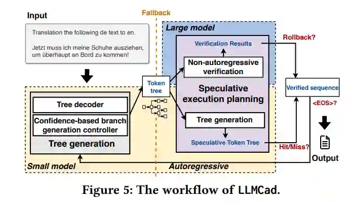 生成性任务,如文本生成和问答,在移动应用领域占据着关键地位。由于对隐私问题的敏感性,对它们在移动设备上直接执行的需求正在增长。目前,执行这些生成性任务在很大程度上依赖于大型语言模型(LLMs)。然而,这些设备的有限内存容量对这些模型的可扩展性构成了严峻挑战。在我们的研究中,我们介绍了LLMCad,一种专门设计用于高效生成自然语言处理(NLP)任务的创新型设备内推理引擎。LLMCad的核心思想围绕模型协作展开:一个位于内存中的紧凑型LLM负责生成最直接的标记,而一个高精度的LLM则负责验证这些标记并纠正任何已识别的错误。LLMCad引入了三种新技术:(1)与按顺序生成候选标记不同,LLMCad利用较小的LLM构建标记树,包含更广泛的可信标记路径。随后,较大的LLM可以高效地同时验证所有这些路径。(2)它采用了一种自动调整的回退策略,当较小的LLM生成错误的标记时,迅速启动验证过程。(3)为了确保标记的连续生成流,LLMCad在验证过程中通过实施计算-IO流水线来猜测生成标记。通过一系列广泛的实验,LLMCad展示了印象深刻的标记生成速度,达到了比现有推理引擎快9.3倍的速度。
