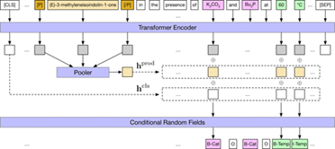 基于以上的思路,作者提出的两阶段架构,即产物提取模块和反应角色标签模块来提取反应。产物提取模块从给定文本中识别所有可能的产物,再对每个产物的上下文中出现的反应角色进行标记,以输入文本和给定的产物为条件,制定一个序列标签任务,并最终构成化学反应。 在输入中添加特殊标记,把目标产物告知Transformer编码器,计算每个词块的隐藏表征,同时将每个单词的第一个单词片段作为条件随机字段(CRF)的输入用于序列标记的解码器。使用“BIO”标记方案对所有剩余标记执行序列标记,以识别相关的反应角色。