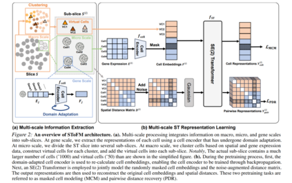 空间转录组学(Spatial Transcriptomics, ST)技术通过保留细胞的空间上下文,为生物学家提供了关于单细胞生物学的丰富洞察。构建用于 ST 的基础模型可以显著提升对庞大且复杂的数据源的分析能力,从而揭示生物组织复杂性的全新视角。然而,ST 数据建模本身具有挑战性,因为它要求从包含大量细胞的组织切片中提取多尺度信息。这一过程需要整合宏观尺度的组织形态结构、微观尺度的细胞微环境以及基因尺度的基因表达谱。