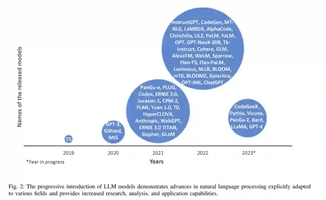 如今,现代LLMs能够在多个领域进行诸如代码生成、文本生成、工具操作、推理和理解等多种任务,在零样本和少样本的情况下,甚至不需要在下游任务上进行任何微调就能做到这一点[8],[9],[10]。以前,较小的模型无法达到这样的泛化,这标志着语言建模的重大进步。这一发展在研究社区中激发了对LLM架构和训练策略改进的热情和兴奋,导致了众多LLMs的开发[11],[12],[13],[8],[9],[10],[14]。图1展示的图表显示了随着时间的推移,发布的LLMs数量(包括开源和闭源模型)的增加趋势。此外,图2突出显示了各种LLMs的重要发布名称。在大型语言模型(LLMs)的早期阶段,许多研究工作都集中在为下游任务开发转移学习的模型[11],[12],[15],直到像GPT-3这样的模型的出现[8],即使不进行微调也表现出了令人印象深刻的性能。由于GPT-3的闭源性质,人们对开源替代品有需求,这导致了各种模型的开发[9],[10],这些模型与GPT-3的规模相当,并在广泛的基于网络的数据集上进行训练[16],[17],[18],[19]。随后,研究人员提出了几种架构设计和训练策略,这些设计和策略在各种任务上显示出优于GPT-3的性能[15],[14],[20],[21]。