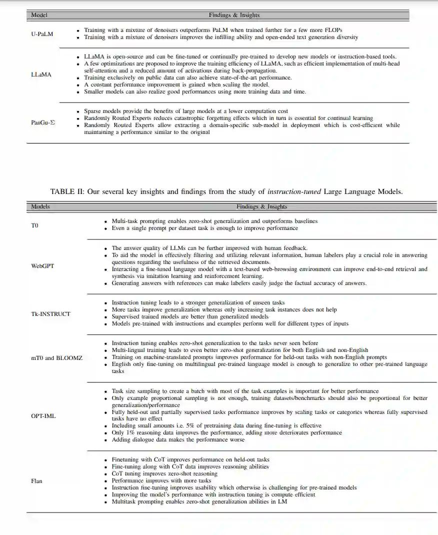 LLMs的性能可以通过指令微调进一步提高,超越了在各种基准测试中预训练的LLMs的表现[22],[23]。LLMs的指令微调指的是在微调阶段引入额外的提示或指令的特定训练方法,以指导输出,从而使用户能够更细粒度地控制LLMs的输出。这些提示可以是自然语言指令,也可以是根据任务需求的示例演示。在文献中,已经为指令微调策略整理了不同的数据集。这些数据集包含更多的实例和任务,进一步提高了对基线的性能[24],[23],[25],[26]。进行指令微调时,需要更新所有的模型参数。然而,参数效率微调采取了不同的方法,只更新少数参数,同时仍然保持良好的性能。这种方法保持原模型不变,而在模型的不同位置添加少量额外的参数[27],[28],[29],[30],[31]。这种方法有助于实现高效的微调,同时最小化对模型总体性能的影响。文献中介绍了采用各种方法的众多预训练和微调模型用于LLMs。一些综述论文提供了LLMs中增强技术的概述[32]。此外,还有一篇全面的评论可供参考,涵盖了架构,微调,新能力,以及LLMs的可用性[33]。另一篇综述提供了基础模型的历史记录[34]。然而,这些评论论文并未深入探讨个别模型的具体细节,只提供了对架构和训练方法的表面理解。相反,我们的论文旨在通过讨论细节,提供更深入的分析单个LLMs。