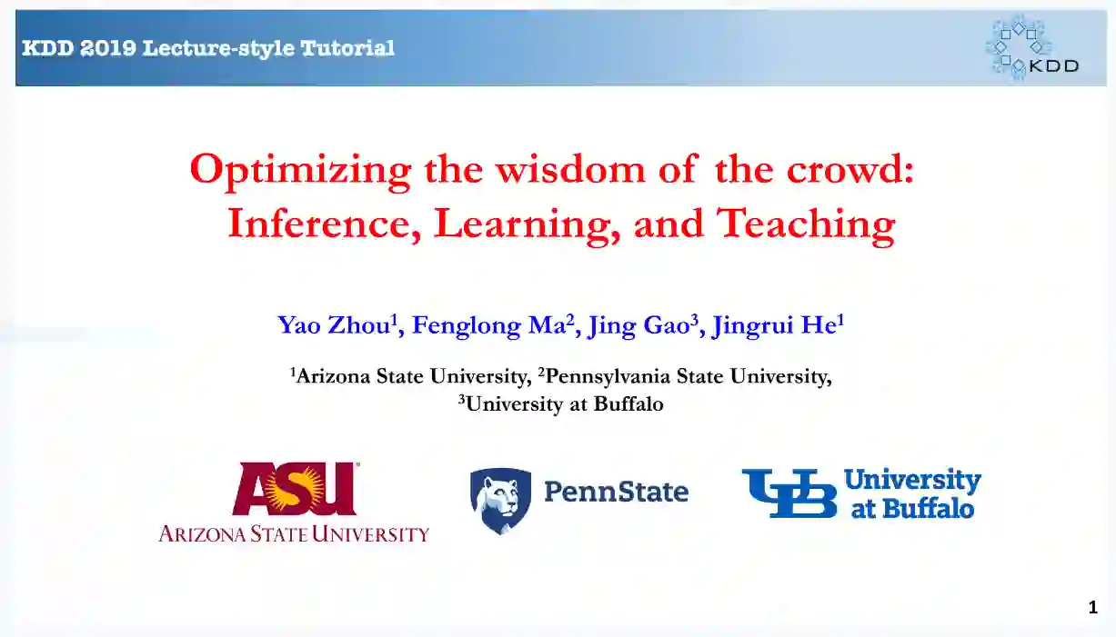 对标记数据的需求日益增长,使得众包在各种高影响的现实世界应用中蓬勃发展,例如协作知识(例如,数据注释、语言翻译)、集体创造力(例如,类比挖掘、众筹)和反向图灵测试(例如,类似验证码的系统),等。在监督学习的背景下,众包指的是注释过程,其中的数据项外包和处理的一组大多是非熟练的在线工作者。因此,研究者或组织能够以较低的成本在短时间内通过人群的反馈收集大量的信息。 尽管众包服务被广泛采用,但它的一些基本问题仍然没有得到解决,特别是在信息和认知层面,如激励设计、信息聚合和异质学习。本教程旨在:(1)从优化群体智慧的角度,全面回顾在探索众包力量方面的最新进展;(2)在人学习的背景下,识别开放的挑战并洞察未来趋势。我们相信这是计算数据科学中一个新兴的和潜在的高影响力的课题,它将吸引学术界和工业界的研究人员和实践者。 与之前关于众包的教程和研讨会相比,本教程的重点将放在各个方面,包括:(1)解决众包真相推断问题的历史和最新出现的技术(即推断众包项目的基本真相标签);(2)不完全预言者的主动学习(即回答下一个应标注哪一个预言者,查询哪一个预言者)和多标记者的异质学习(即多任务学习和众包标签的多视角学习);(3)监督众包工作者以教学的形式学习和标注(即向众包工作者传授一个概念,如标注图像或对文档进行分类)。。