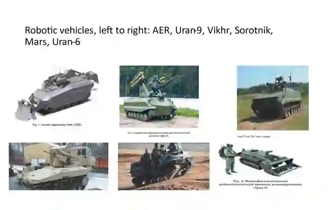 俄罗斯军方已经开发了许多机器人能力,包括以下内容:战车射击系统;多管火箭系统;放射性侦察;后勤运输;太空使用;无船员船舶和潜艇;以及机器人群和群体互动,等等。军事领导人已经确定,有机制确保对这些资产的控制,这些资产只能在有限的情况下使用。然而,俄罗斯在众多行动中使用机器人的计划可能表明,它们的使用可能并不像预测的那样有限。在军事领域,快速寻求优势是超越对手的中心环节。