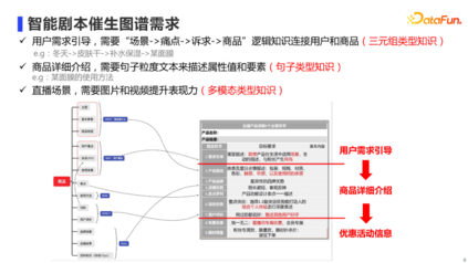 那么,直播场景下到底需要一个什么样的多模态知识图谱?我们可以先拆解一下主播是如何播报商品的。如右图所示,我们把主播讲解过程进行半结构化,可以看到,他们一般还是会遵循一定的套路。比如会先进行需求引导,也就是说用户一般在什么生活场景下,会遇到什么痛点,进而产生什么诉求,而我们的商品正好可以满足这个诉求。然后会对商品各方面进行详细介绍等。最后会提专属优惠、限时限量来引导下单。从这个流程中,我们就可以梳理出对图谱的结构化需求,如左图所示。概括来说,我们分为三大类: 第一类是三元组类型知识。主要需要“场景-痛点-诉求-商品”这样有逻辑性的知识,来对用户进行需求引导,也就是说他为什么要买这个商品。 第二类是句子类型知识。我们直播时需要对商品各方面进行详细介绍,而这种介绍需要句子粒度的信息,例如使用方法这个要素,需要有一段句子来进行介绍的。 第三类是多模态类型知识。在直播场景下,除了商品介绍,也需要有相应的商品和视频展示,从而提升数字人直播的表现力。 02