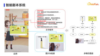 众所周知,在电商平台上,直播带货已经是商家重要的卖货和营销手段。在淘宝直播平台上,除了少量的头部主播外,还有很多店播,也就是商家会自己开直播为自家的商品进行直播带货。但是商家自己开直播其实成本不低,例如需要招募主播、培养主播等,并且找主播相当于找代言人,如果主播发生负面事件,那么就存在店铺形象受损的风险。再者,主播也不能做到24小时直播带货。 因此,我们希望引入数字人主播来帮助商家解决以上问题,商家只要“一键开播”,就可以让我们的数字人主播为其进行直播带货。这样一方面帮助商家降低开直播的成本和风险,另一方面也可以实现24小时直播带货。这里右侧展示了我们和某美妆商家合作的数字人主播,该数字人可以自动进行商品的介绍、展示相应的商品图片和视频,这个能力主要通过我们的智能剧本系统来实现。 1. 智能剧本系统