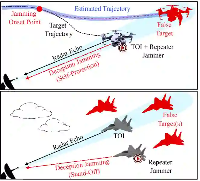 图 1:欺骗干扰对雷达信号接收的影响示意图:(上图)跟踪欺骗误导雷达估计错误的目标轨迹。(下图)产生多个假目标,阻碍目标探测。