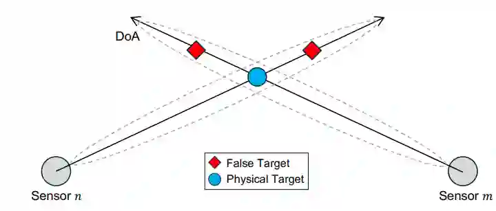 最新研究表明,协同式欺骗干扰技术能够突破雷达网络空间分集优势。文献[58]所述协同欺骗方法可推断网络拓扑结构并同步生成多雷达虚假目标,克服图7所示的对齐偏差问题。此类场景中,多雷达提供的空间分集不足以区分真实与虚假目标,凸显增设防护层必要性。对此,文献[58]提出整合无源雷达与共识数据共享机制的协同抗干扰方案,提升存在协同干扰时的目标跟踪鲁棒性。此外,文献[50]探讨了分布式MIMO雷达网络的相关性,作者基于博弈论框架分析MIMO网络与干扰源的动态对抗,该内容将在下节详述。在此框架下,各MIMO雷达以最小发射功率实现干扰机与回波间互信息最大化。分布式MIMO还被用于协同资源调度提升多目标跟踪性能[55][61],以及通过因子图建模与迭代消息传递算法联合估计真实/虚假目标参数[54]。增强分布式雷达系统抗欺骗干扰韧性的研究仍处活跃阶段,现有方法需引入更贴近实际的假设条件,例如解决传感器视场非重叠挑战[58]。文献[56]则致力于应对分布式雷达系统中因传感器同步失败导致的配准误差问题。