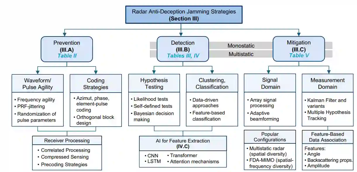 将预防策略定义为在传输过程中动态调整雷达信号参数,以阻碍干扰器成功复制目标回波的能力。这通常是通过在雷达信号设计中引入不可预测性或复杂性来实现的,同时还对接收器处理过程进行修改,以更有效地防止欺骗。