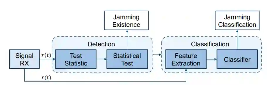 图 6:干扰信号检测和分类示意图。从接收到的信号中计算出统计指标用于假设检验,而提取特征用于分类。请注意,分类不需要事先进行检测。