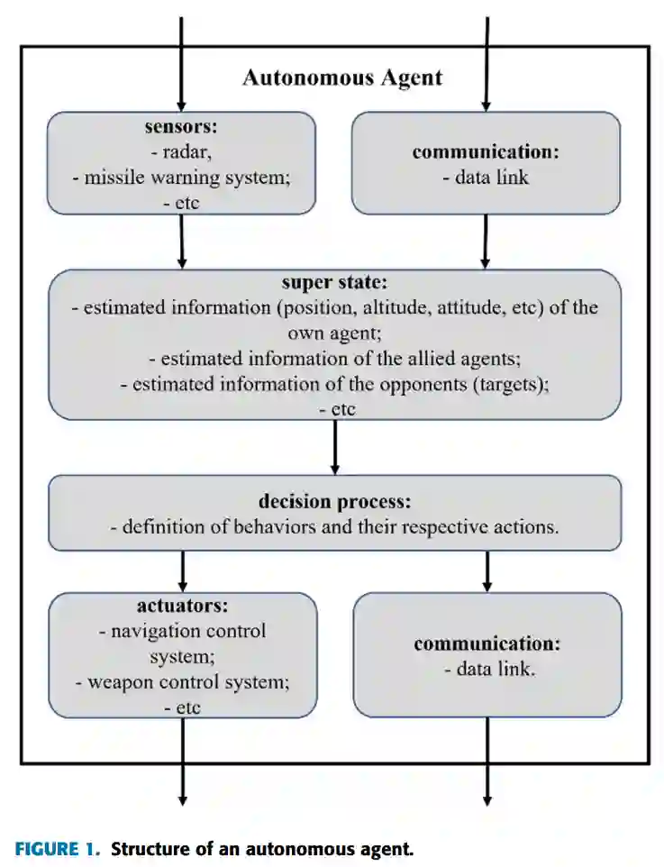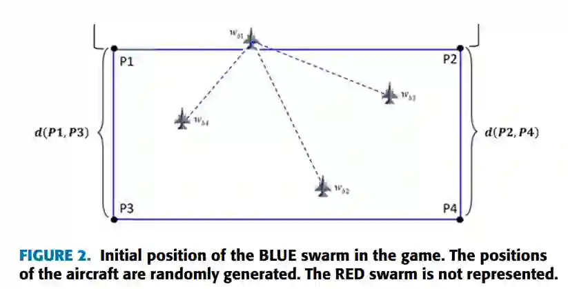 由于具有一些性能上的优势,如增加敏捷性、增加过载耐久性和增加隐身能力,无人机已经逐渐发展起来,并在许多空中任务中取代了有人系统[3]。然而,由于战斗的动态性质,在视觉范围之外的空战中用无人系统取代有人平台是具有挑战性的。在空战中,无人机可以被远程控制,但由于无人机飞行员对形势的认识有限,它将在与有人平台的对抗中处于劣势。然而,这种限制可以通过自动战斗机动[4]和战术编队的优化来克服。此外,使用无人机可以允许一些战术编队和战略,而这些战术编队和战略在有人驾驶的飞机上是不会被考虑的,例如允许中队的飞机被击落,如果它有助于团队赢得战斗。文献中最早的一篇旨在优化超视距(BVR)作战中的飞机战术编队的文章[5]表明,空战战术是用遗传算法(GA)进行优化的候选方案。该实施方案采用分层概念,从小型常规作战单位建立大型编队战术,并从两架飞机的编队开始,然后是四架飞机,最后是这些飞机的倍数。在模拟中没有对导弹发射进行建模。当一架飞机将其对手置于武器交战区(WEZ)的高杀伤概率(Pkill)区域内一段特定时间,简化的交战模拟器就宣布伤亡。事实证明,所提出的方法的应用是有效的,它消除了团队中所有没有优化编队的飞机,并为整个优化编队的飞机团队提供了生存空间。