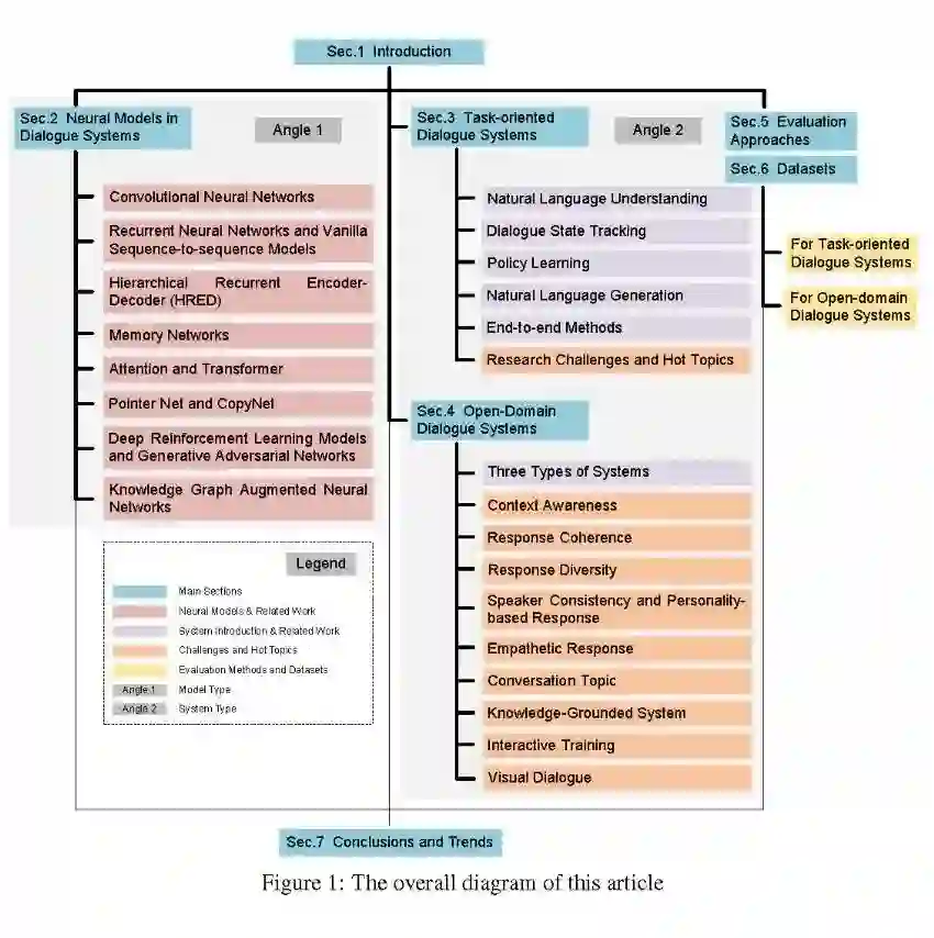 我们为这篇长文章制作了一个图,以帮助读者熟悉整体结构(图1)。在这个综述中,第一部分简要介绍了对话系统和深度学习;第二节讨论了现代对话系统中流行的神经模型及其相关工作;第三部分介绍了任务导向对话系统的原理和相关工作,并讨论了当前的研究挑战和热点问题;第4节简要介绍了这三种系统,并重点介绍了开放域对话系统的研究热点;第5节回顾了对话系统的主要评价方法;第6节全面总结了对话系统常用的数据集;最后,第七部分对全文进行了总结,并提出了一些研究趋势。