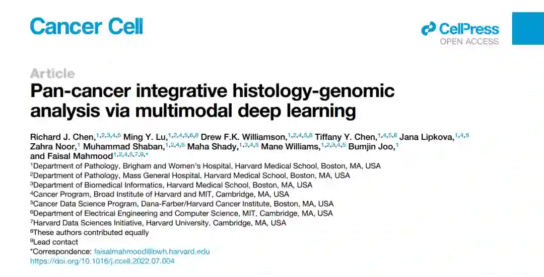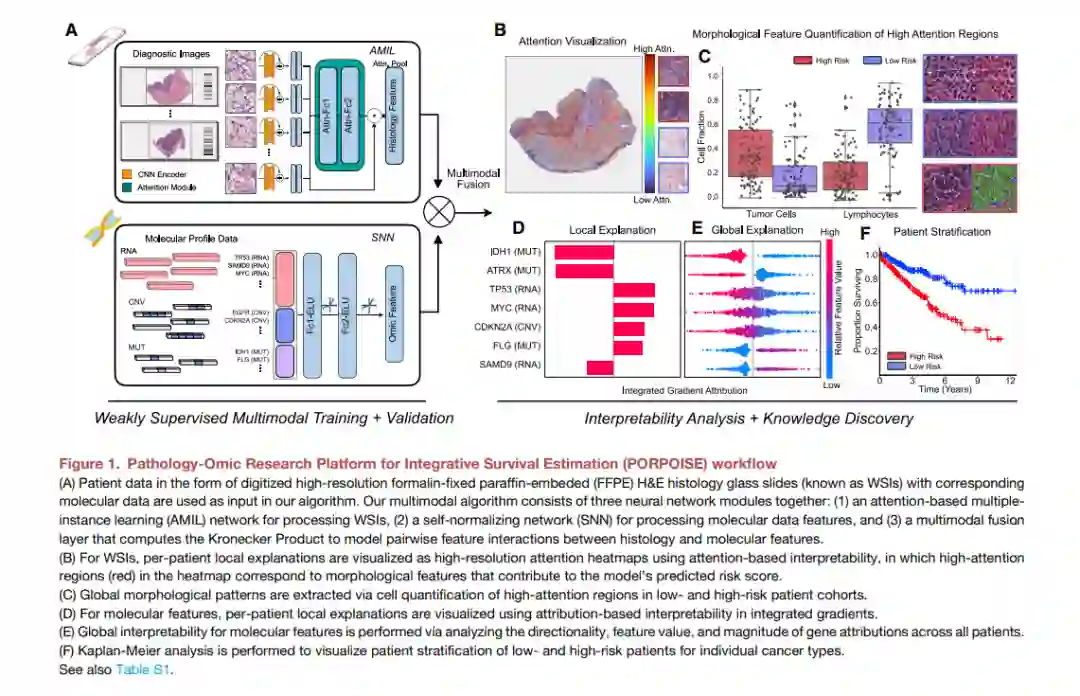 快速出现的计算病理学领域已经证明有希望从组织学图像开发客观的预后模型。然而,大多数预后模型要么仅基于组织学,要么仅基于基因组学,并没有解决如何整合这些数据源来开发联合的图像组学预后模型。此外,从这些模型中确定可解释的形态和分子描述符来控制这种预后也很有意义。我们使用多模态深度学习联合检查来自14种癌症类型的病理全图像和分子剖面数据。我们的弱监督、多模态深度学习算法能够融合这些异质模式来预测结果,并发现与不良和有利结果相关的预后特征。我们在一个交互式开放数据库中对14种癌症类型在疾病和患者水平上的患者预后的所有形态学和分子相关性进行了分析,以允许进一步的探索、生物标志物发现和特征评估。
