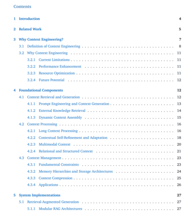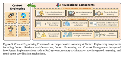为了解决这一关键问题,本综述提供了首个关于LLMs上下文工程的全面且系统的回顾。我们的主要贡献是提出了一个新颖的、结构化的分类法,分类了用于设计、管理和优化上下文的多种技术。该分类法将该领域组织为连贯的类别,区分了基础组件及其在复杂系统实现中的整合。通过这一框架,我们:(1) 提供了每个领域最新技术的清晰且结构化的概述;(2) 分析了不同方法的核心机制、优点和局限性;(3) 确定了全局性挑战,并为未来研究指明了有前景的方向。此工作既是导航复杂上下文工程领域的技术路线图,也是促进更深入理解和催生未来创新的基础。