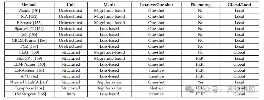 本节介绍了针对LLM的剪枝方法,包括其顺序和特点,并进行了全面的比较。这些方法采用与中等规模语言模型所使用的并行方法相同的方法,但省略了微调过程。表3总结了LLM的各种修剪方法,这些方法在LLM领域具有广泛的应用前景。表3 对LLM的各种修剪方法的总结