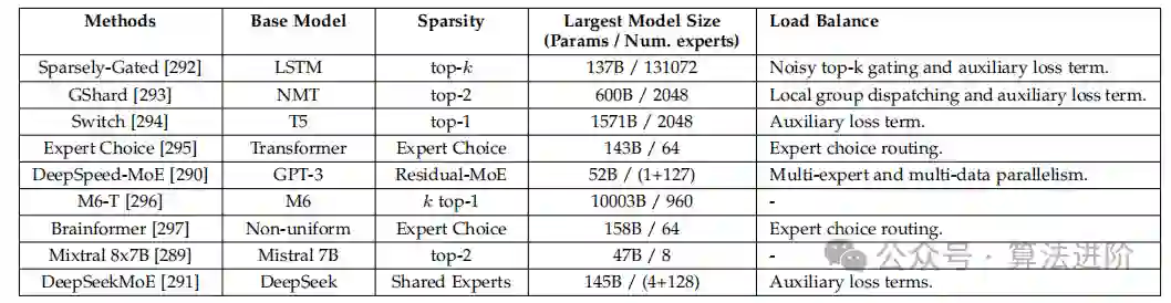 动态网络(DyNN)是一种在资源受限环境下处理大型语言模型(LLM)的方法,它只使用网络的一部分来处理每个输入,从而降低计算和内存需求。在自然语言处理(NLP)和LLM领域,当前的DyNN研究主要包括三种方法:早期退出、级联推理和混合专家(MoE)。早期退出旨在在深度神经网络的早期层动态终止推理过程,以减少响应时间。级联推理将模型分解为多个子模型,每个子模型处理输入序列的不同部分。混合专家将模型分解为多个专家,每个专家处理输入序列的不同部分。这些方法可以结合其他压缩加速方法来提高LLMs的效率。表5中总结了一些具有代表性的MoE方法。表5 各种MoE方法总结
