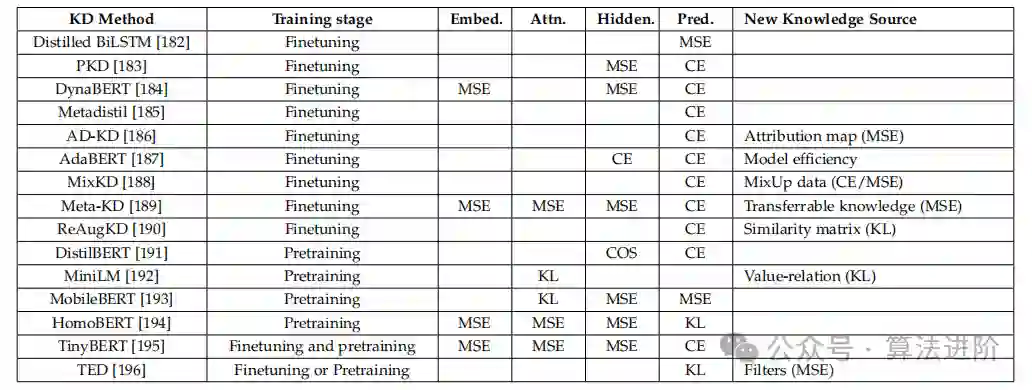 中等规模的语言模型基于transformer结构,通过预训练和微调两个阶段进行训练。预训练阶段使用大规模的无标签数据集,学习语言的通用特征和结构;微调阶段使用带标签的数据,使其适应特定任务。模型蒸馏可分为微调蒸馏和预训练蒸馏两类。表4展示了各种中等规模模型蒸馏方法的训练阶段、知识来源和损失函数。表4 BERT各种KD方法的总结。嵌入、注意力、隐藏和预测代表知识分别来自嵌入、注意力机制、隐藏层和模型的预测。