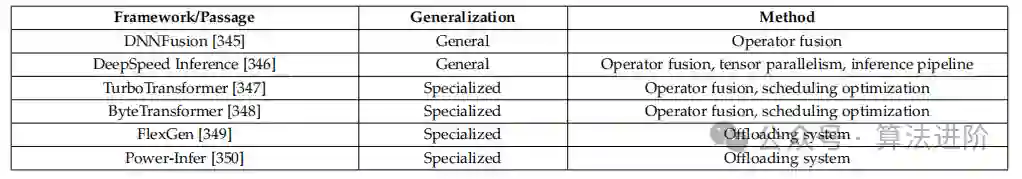 本章主要介绍了一些用于加速大型语言模型(LLM)推理的框架。这些框架旨在提高 LLM 在不同场景下的效率,包括延迟、吞吐量和内存等。这些框架可以分为通用框架和特定框架。通用框架包括 DNNFusion 和 DeepSpeed Inference,它们可以应用于各种场景,而特定框架则针对特定场景进行优化,如 TurboTransformer 和 ByteTransformer。表6为各种加速框架的总结。这些框架通过操作融合、张量并行、推理管道和卸载系统等技术来提高 LLM 的推理效率。表6 各种加速框架的总结
