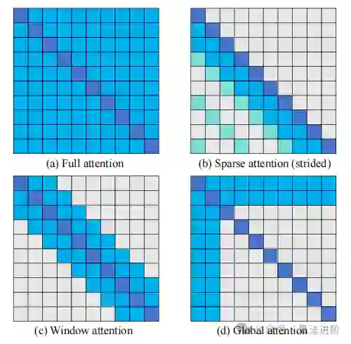 Transformer中的标准自注意力机制时空复杂度为O(N2),阻碍了处理长序列问题的能力。为了解决这个问题,出现了高效注意力工作,包括稀疏注意力、线性近似注意力和闪存注意力等。 稀疏注意力方法允许每个标记只关注局部或主要相关的项,从而实现稀疏注意力模式,从而降低计算和内存需求。稀疏注意力方法可以分为基于全局、基于窗口和基于数据三种方法。基于全局的方法包括全局注意力、基于窗口的方法包括局部注意力和固定注意力模式,基于数据的方法包括随机注意力和数据驱动的稀疏注意力。 图6 比较稀疏注意力模式。(a) 完全自注意力(b) 步长注意力(c) 窗口注意力(d) 全局注意力 线性近似注意力方法以解决标准注意力计算中存在的二次时间复杂度问题。线性近似注意力计算方法可以分为基于关联性和低秩的方法。基于关联性的方法通过计算 KTV 并利用软最大化实现线性注意力,而低秩方法则通过将 QKT 分解为低秩矩阵实现线性注意力。 6.2 神经架构搜索(NAS)