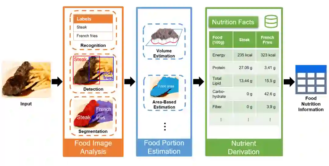 近年来,计算机视觉的快速发展使得自动的膳食评估成为可能**。本文总结出两种基于视觉分析的膳食评估框架**。针对多阶段膳食评估框架,从面向食品图像的识别、检测和分割等方面全面论述了食物图像分析的相关工作,然后对体积估计方法进行了系统性阐述,同时剖析了该框架存在的问题。在此基础上系统总结了端到端的膳食评估框架,并对相关工作进行梳理。本研究能够丰富人们对于膳食评估的认识,并鼓励相关研究人员针对基于视觉分析的营养评估提出更实用的解决方案。