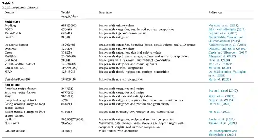 在本节中,我们介绍了营养评估数据集及评价指标。表3从不同方面详细介绍了现有的营养评估数据集,如数据集大小、类别、体积、大量营养素(即碳水化合物、蛋白质和脂肪)。一个膳食评估系统应该在多个方面进行评估,例如准确性、运行时间和资源需求。然而,大多数研究人员只关注评估准确性的指标。对于多阶段方法,应针对每个阶段进行评估。相比之下,端到端方法应作为一个整体进行评估,这类似于多阶段方法的最后一个阶段。由于每个阶段的不同,评估指标按输出类型进行分类和总结。更多细节描述详见文章 Section 5。