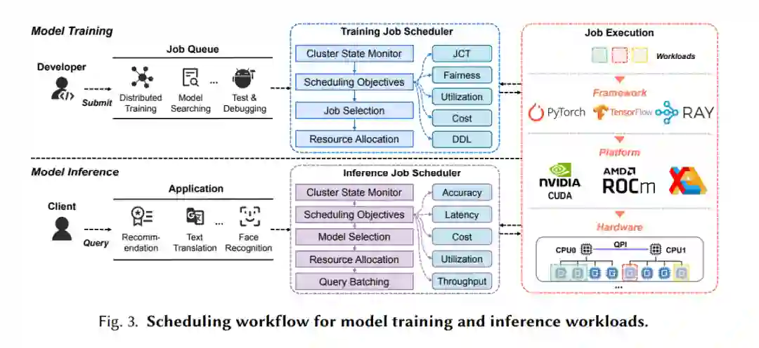 调度器负责确定整个数据中心的资源利用率和每个作业的性能,从而进一步影响操作成本和用户体验[42]。具体来说,(1)对于模型训练,调度器分配用户请求的资源,以支持长时间运行的离线训练工作负载。调度器需要为每个单独的工作负载实现高性能,为整个数据中心实现高资源利用率,并在不同用户之间实现高公平性。由于DL训练工作的特殊性和复杂性,传统的高性能计算(HPC)和大数据负载调度算法会导致资源利用率不均衡和基础设施费用过高[157],需要为GPU数据中心量身定制新的解决方案。(2)在模型推理中,DL应用通常作为在线服务来回答用户的请求。他们通常对响应延迟和推断精度有更高的期望[25,172]。未能在指定时间内完成(服务水平协议)或精度低于预期的应用程序可能很少或没有商业价值。因此,调度器在推断延迟、准确性和成本之间的平衡是至关重要的。
