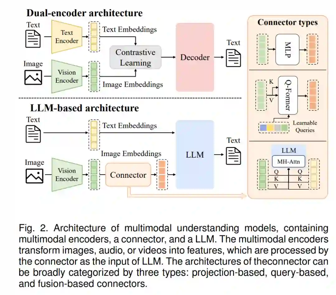 多模态理解模型指的是基于大语言模型(LLMs)的架构,能够处理多模态输入,执行推理任务,并生成相应输出的模型 [47]。这类模型将 LLM 在文本生成与推理方面的能力扩展至更广泛的信息模态,实现了丰富的语义理解 [42], [48]。现有方法的主要研究集中于视觉-语言理解(Vision-Language Understanding, VLU),即融合视觉(如图像与视频)与文本输入,以支持对空间关系、对象、场景和抽象概念等更全面的理解 [49], [50], [51]。图 2 展示了多模态理解模型的典型架构。 这类模型在混合输入空间中运行,其中文本数据以离散形式表示,而视觉信号则通过连续表示进行编码 [52]。与传统 LLM 类似,其输出以离散 token 的形式生成,通常采用基于分类的语言建模方式以及特定任务的解码策略 [8], [53]。 早期的 VLU 模型主要采用双编码器架构(dual-encoder),将图像与文本分别编码后,在对齐的潜在表示空间中联合进行推理,如 CLIP [22]、ViLBERT [54]、VisualBERT [55] 与 UNITER [56]。尽管这些先驱模型奠定了多模态推理的基础原理,但它们高度依赖区域级的视觉预处理以及独立编码器,限制了模型的可扩展性与通用性。 随着强大 LLM 的出现,VLU 模型逐渐过渡到纯解码器架构,采用冻结或仅轻微微调的语言模型主干。这些方法通常通过结构化的连接器将图像嵌入投射到语言模型的 token 空间中,如图 2 所示。例如,MiniGPT-4 [57] 使用单层可学习的线性映射,将 CLIP 提取的图像嵌入映射到 Vicuna [58] 的 token 空间;BLIP-2 [53] 提出了查询变换器(querying transformer),用于连接冻结的视觉编码器与冻结的 LLM(如 Flan-T5 [59] 或 Vicuna),在大幅减少可训练参数的同时,实现高效的视觉-语言对齐;Flamingo [60] 则引入门控跨模态注意力层(gated cross-attention),连接预训练的视觉编码器与冻结的 Chinchilla [61] 解码器。 近年来,VLU 的发展趋势正朝向更通用的多模态理解演进。GPT-4V [62] 将 GPT-4 框架扩展至图像输入分析,展示了出色的视觉推理、图像描述与多模态对话能力,尽管其具体机制仍为专有。Gemini [63] 构建在纯解码器架构之上,支持图像、视频与音频等多种模态,其中 Ultra 版本在多模态推理任务中创下新基准。Qwen 系列展示了可扩展的多模态设计:Qwen-VL [5] 引入视觉感知模块与语义对齐模块,Qwen2-VL [9] 则进一步加入动态分辨率处理机制与 M-RoPE,用于适应多样输入。LLaVA-1.5 [64] 与 LLaVA-Next [65] 均结合了 CLIP 视觉编码器与 Vicuna 风格的 LLM,在视觉问答(VQA)和指令跟随任务中取得优异性能。 InternVL 系列 [11], [66], [67] 探索了统一的多模态预训练策略,采用文本与图像的联合学习机制,在多项视觉-语言任务中显著提升表现。Ovis [12] 则通过可学习的视觉嵌入查找表引入结构化嵌入对齐机制,使视觉嵌入在结构上模拟文本 token。近期也有模型探索可扩展、统一的多模态架构,例如 DeepSeek-VL2 [68] 采用专家混合架构(Mixture-of-Experts, MoE)以增强跨模态推理能力。 总体而言,这些模型展现出向指令调优(instruction-tuned)和 token 为中心(token-centric)架构的明确转变,具备处理多样多模态任务的统一性与可扩展性。
