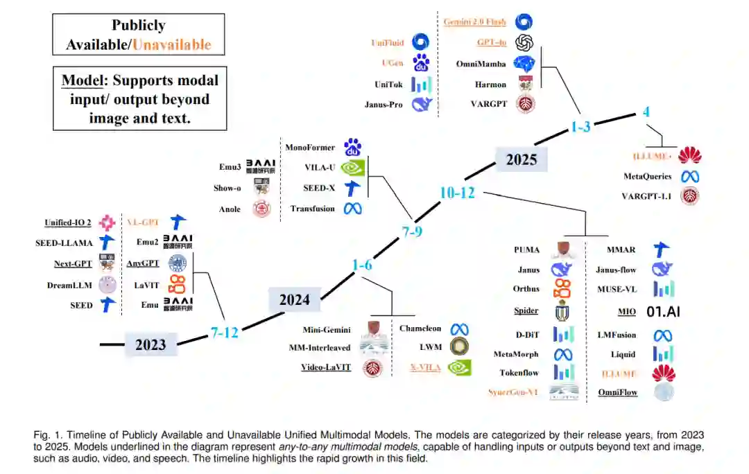 摘要—近年来,多模态理解模型与图像生成模型均取得了显著进展。尽管各自取得了成功,但这两个领域的发展相对独立,形成了各自不同的架构范式:多模态理解领域主要采用自回归架构,而扩散模型已成为图像生成的核心技术。近年来,越来越多的研究开始探索将这两个任务融合到统一框架中的可能性。GPT-4o 的新能力正是这种趋势的体现,显示出统一建模的巨大潜力。然而,这两个领域在架构上的差异带来了重大挑战。为了全面梳理当前在统一建模方向上的研究进展,我们开展了一项系统综述,旨在为未来研究提供指导。首先,我们介绍了多模态理解与文本到图像生成模型的基础概念与最新进展。接着,我们对现有的统一模型进行了分类综述,归纳为三种主要的架构范式:基于扩散的模型、基于自回归的模型,以及融合了自回归与扩散机制的混合方法。对于每一类模型,我们分析了其结构设计及相关工作的创新点。此外,我们整理了适用于统一模型的公开数据集与评测基准,为后续研究提供资源支持。最后,我们讨论了该新兴领域面临的关键挑战,包括符号化策略、跨模态注意力机制及数据问题。由于该领域仍处于早期阶段,我们预计将迅速发展,并计划定期更新本综述。我们的目标是激发更多研究灵感,并为研究社区提供有价值的参考。本文所引用的文献将很快在 GitHub 上公开。