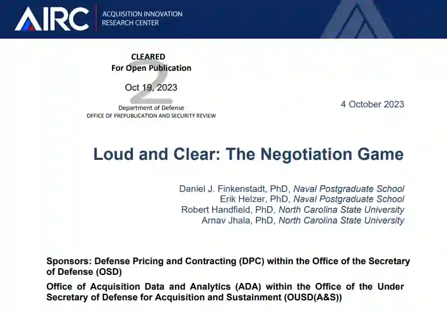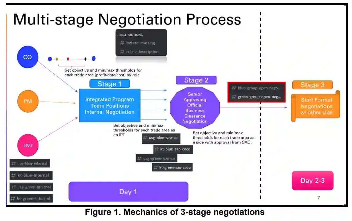 美海军研究生院(NPS)和北卡罗来纳州立大学(NCSU)的研究团队制作了一套谈判场景,并将其纳入一个交互式玩家平台,允许团队在谈判团队中扮演政府或行业方面的各种角色。玩家们相互竞争,并努力在各自的任务、限制和目标下为自己的团队找到最佳解决方案。研究人员评估了团队在各种复杂的谈判交易、各种制约因素和信息不对称的情况下是如何互动的。