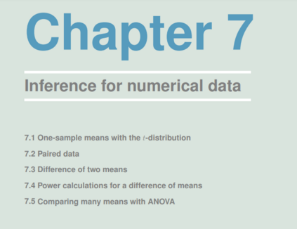 7. 对数值数据的推断。使用t分布推断一个或两个样本平均值,比较两组的统计力量,也使用方差分析的许多平均值的比较。