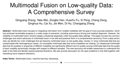 多模态融合致力于整合来自多种模态的信息,目的是实现更准确的预测。在包括自动驾驶和医疗诊断等广泛的场景中,多模态融合已取得显著进展。然而,在低质量数据环境下,多模态融合的可靠性大部分仍未被探索。本文综述了开放多模态融合面临的常见挑战和最新进展,并将它们呈现在一个全面的分类体系中。从数据中心的视角,我们确定了低质量数据上多模态融合面临的四个主要挑战,即**(1)噪声多模态数据,它们被不同种类的噪声污染;(2)不完整的多模态数据,某些模态缺失;(3)不平衡的多模态数据,不同模态的质量或属性有显著差异;以及(4)质量变化的多模态数据**,每种模态的质量会根据不同样本动态变化。这一新的分类体系将使研究人员能够理解该领域的现状,并识别出几个潜在的研究方向。我们还讨论了这一领域的开放问题以及有趣的未来研究方向。